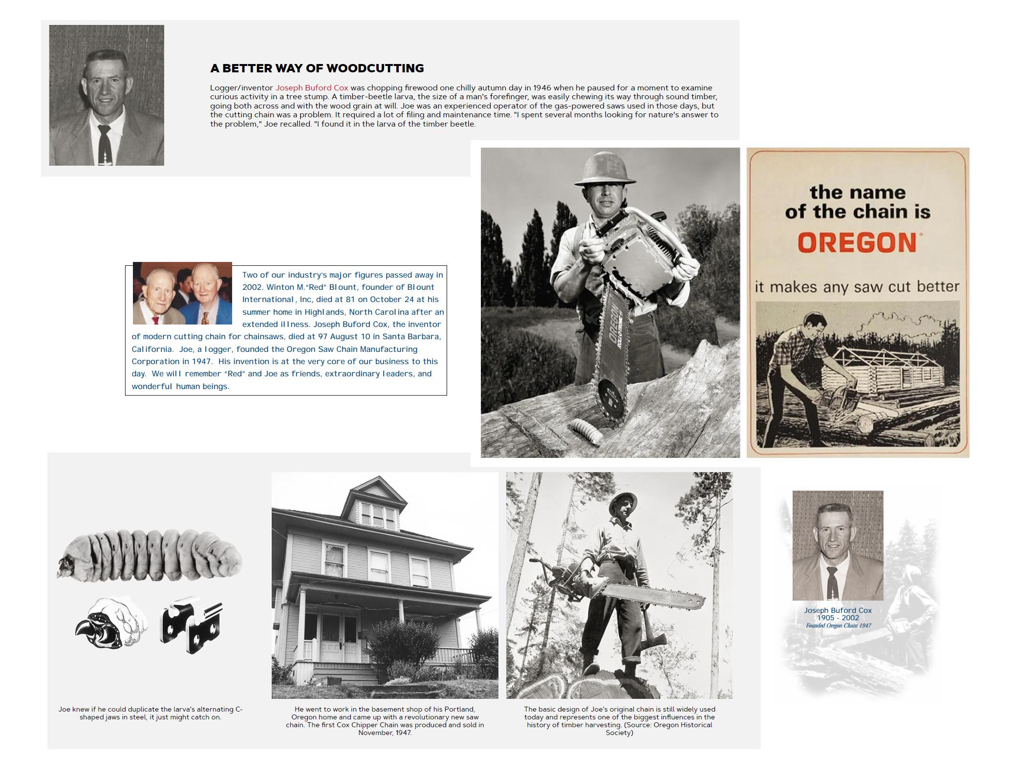 Joseph B. Cox invente la dent de gouge pour les chaînes de scie. Cela rend les tronçonneuses beaucoup plus efficaces. Il s'agit d'une étape importante dans l'évolution de la tronçonneuse. La dent de gouge est actuellement encore d'usage courant. Joe Cox a fondé une entreprise qui a mis sur le marché les premiers produits Oregon®.