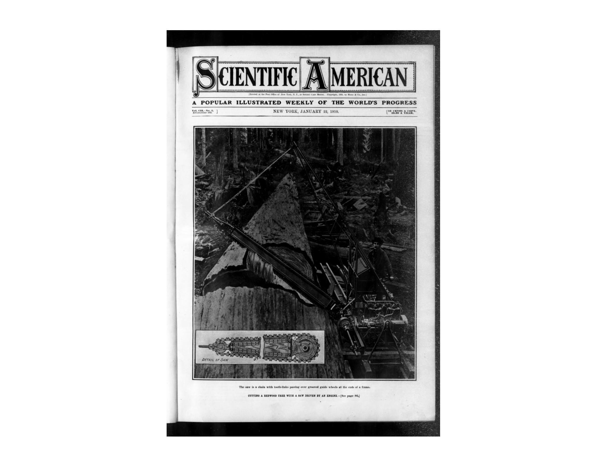 Le magazine "Scientific American" montre en première page une photo d'une tronçonneuse lourde, plutôt stationnaire, coupant un tronc d'arbre abattu.